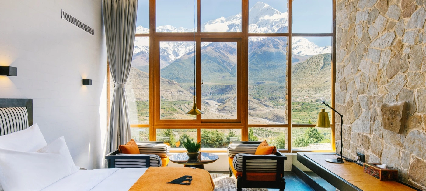 Shinta Mani Mustang stands on the slope above Jomsom, looking straight to the Nilgiri range and the Kali Gandaki valley. Built from local stone and wood, with Tibetan-inspired details and Bill Bensley’s design, it feels more like a contemporary mountain house than a standard lodge. The 29 suites are all front-facing, with floor-to-ceiling windows and cosy living areas that stay warm even on cold Mustang evenings.