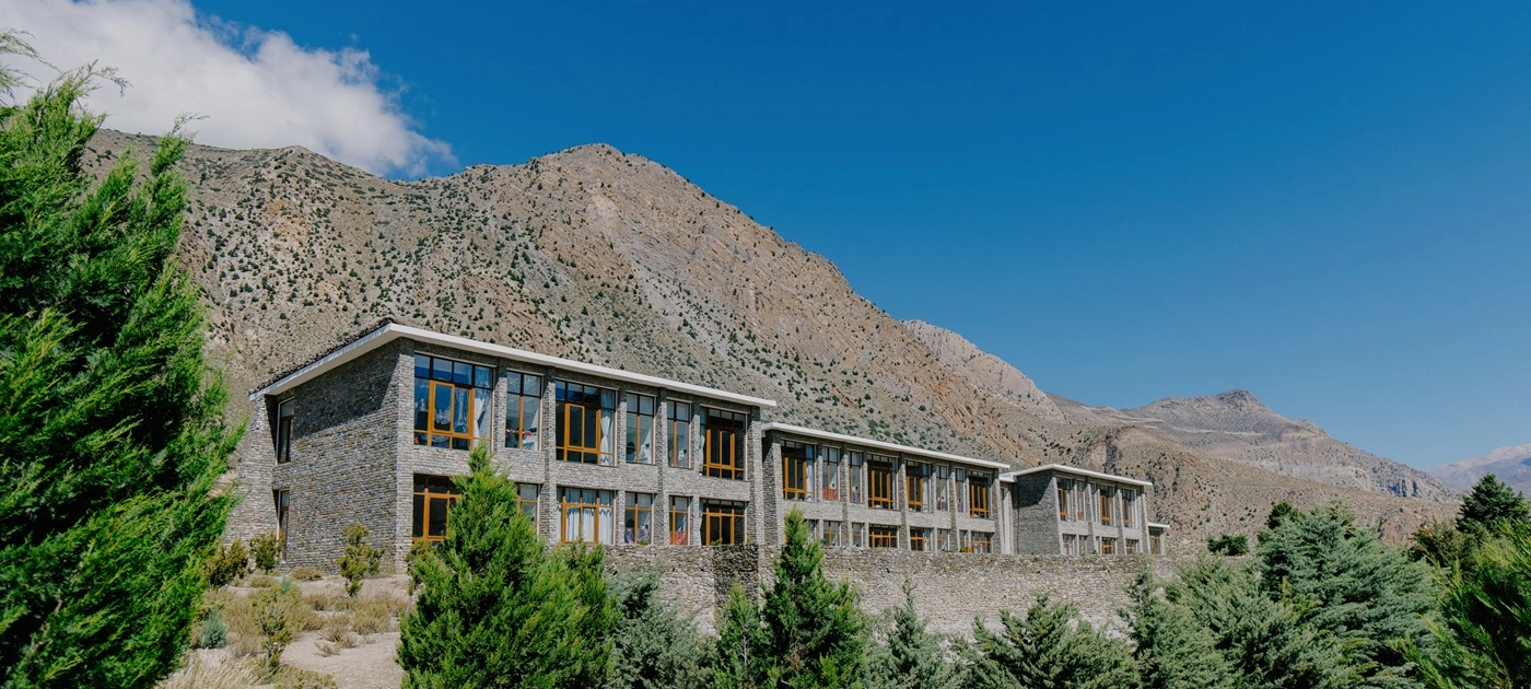 14 rooms. Stone-built. Named by TIME magazine as one of the World’s Greatest Places to Stay in 2026. Floor-to-ceiling windows framing Annapurna and Gangapurna. Heated beds at 11,000+ feet. Sauna. Steam room. Day hikes to the 600-year-old Braga Monastery. Glacial lake walks. Winter snow leopard tracking expeditions. The flagship of high-altitude hospitality.