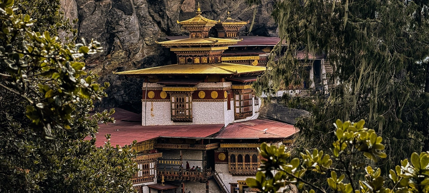 1.1 kilometres. 100 meters of gain. 40 minutes. The gradient eases. The forest thins. And then you turn a corner, and the Tiger’s Nest appears across the gorge — white walls and gold roofs hanging on a vertical cliff face 900 meters above the valley floor. This is THE photograph.