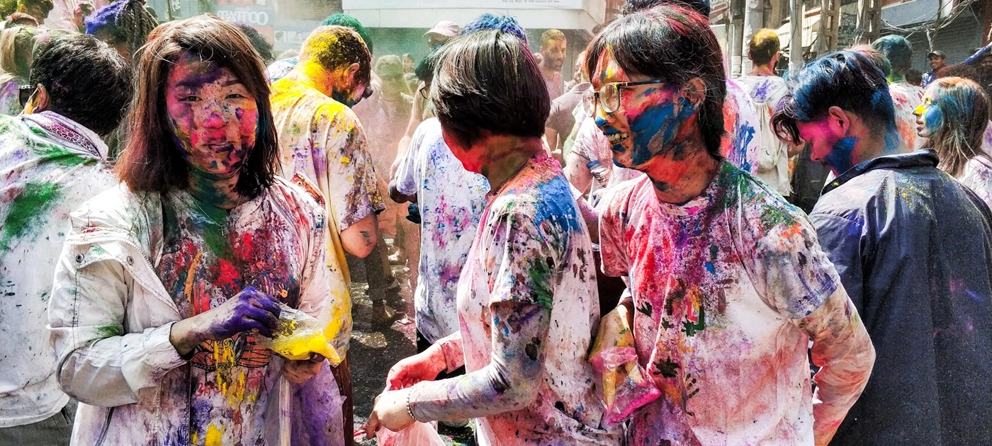 Holi is a single-day explosion of colored powder, water balloons, music, and unstructured joy. It marks the arrival of spring and celebrates the Hindu legend of Holika — the burning of the demoness who tried to destroy the devotee Prahlad.